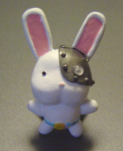 本体はプラモデル用エポキシパテでこねこね。左目の鉄仮面は質感の違いを出したくてポリエステルパテで成形。ついでに耳もポリパテで作ってみたけど、形が気に入らなかったのであらためてエポパテで作り直し。プラ板を耳の内側(ピンクの部分)の形に切り出して、パテを押し付け耳の形に。