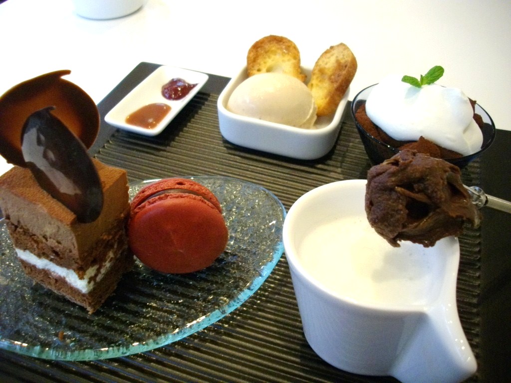手前は左からチョコレートケーキにチョコレートマカロン、